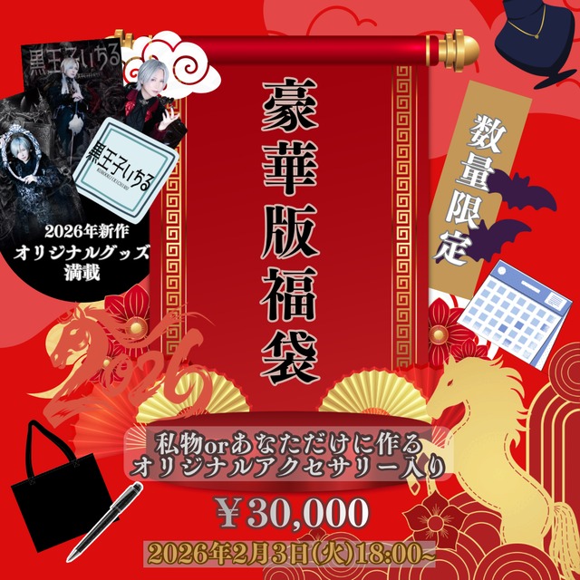 福袋豪華版各¥30000<数量限定6> ※通常版豪華版共に販売期間は2026年2月3日18時~2月28日23:59までとなります。 ※3月中の発送を予定しております。 ※画像は内容物のイメージとなります。 <セット内容> ╴豪華版内容 ╴ ・私物 or あなただけに作るオリジナルアクセサリー ※オリジナルアクセサリーはデザイン・素材・使用箇所は完全お任せ。私物の場合は欲しいものを一覧より選び備考欄にご記入ください(先着順で確定&被りは再度先着順でご希望を聞きます)。アクセサリー希望の場合は備考欄にアクセサリー希望とご記入ください。 ・トートバッグ ・ポーチ ・クリアファイル ・ボールペン ・大きいアクリルスタンド(15cm) ・2026年 クロノヒトトセ × 物語カレンダー ・目印アクセサリー ・コウモリクリップ ・前髪クリップ ・ハンカチタオル ・ロゴシール ・ロゴネイルシール ・ミニサイン色紙 ・サイン&一言メッセージ入りブロマイド ・サイン券 ×5枚 ■私物について いちるの私物はどれもお気に入りでよく使用していた物を封入させていただきます。クロノヒトトセ使用のものは具体的な物はご指定頂けません。 私物はX、インスタグラムに着ている写真、着けている写真が色々とあるのでご購入後お手元に届きましたら是非探してみてください♪ ■黒王子いちるの私物内容 ▶各箇所で使ったベージュエプロン ▶普段使用くまさんパジャマ上着(撮影にも使用) ▶クロノノヒトトセ使用服or小物 ▶腕ビリビリパーカー(金木コスでも使用) ▶私服(お任せ) ▶私物アクセサリー